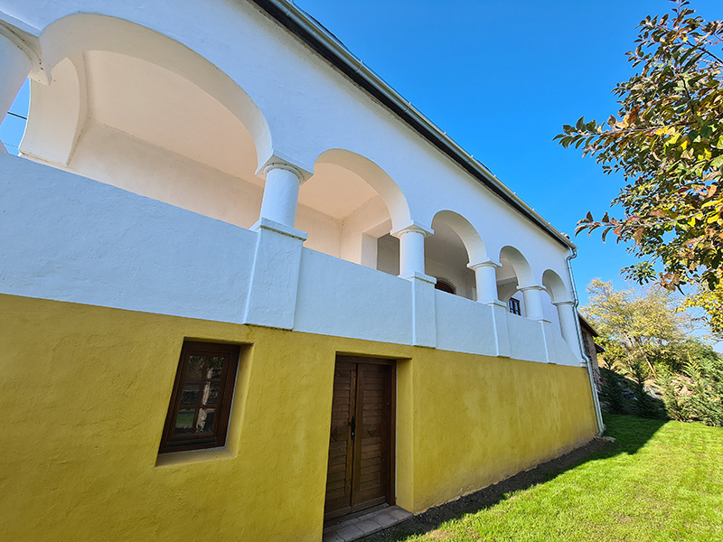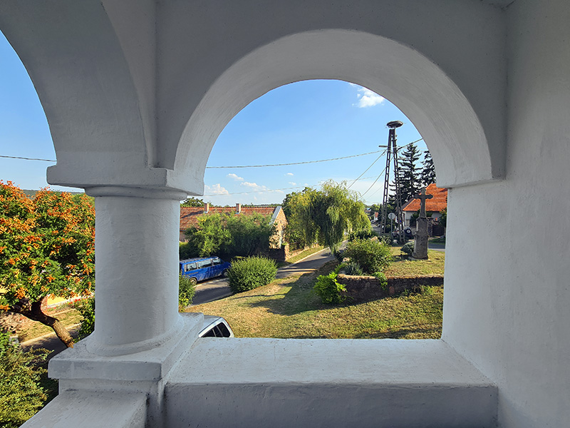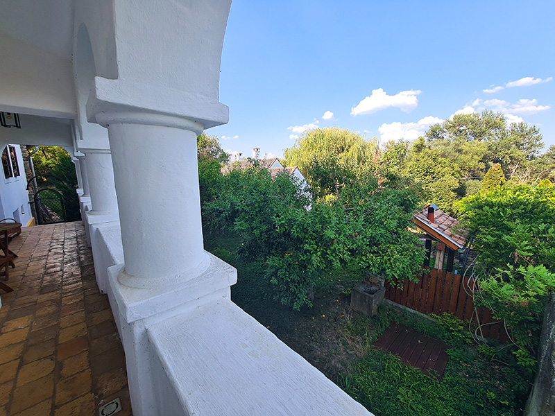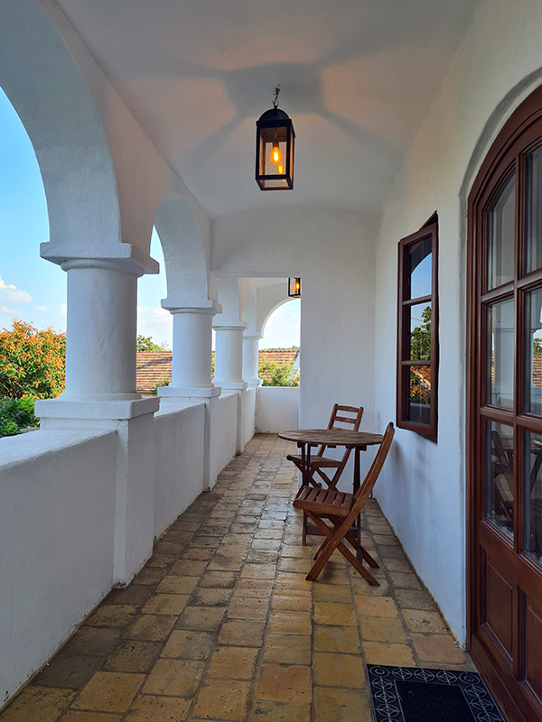 - Hosszú boltíves terasz, kilátás a kertre és a falura.