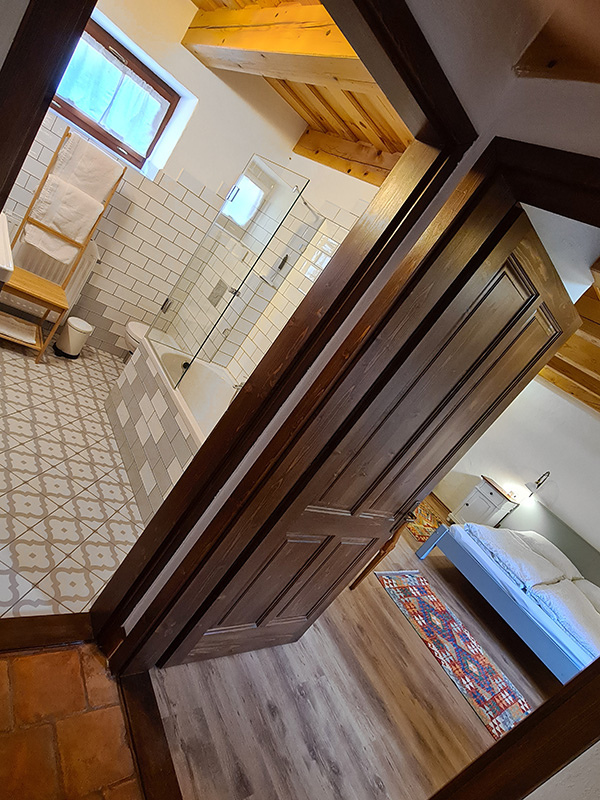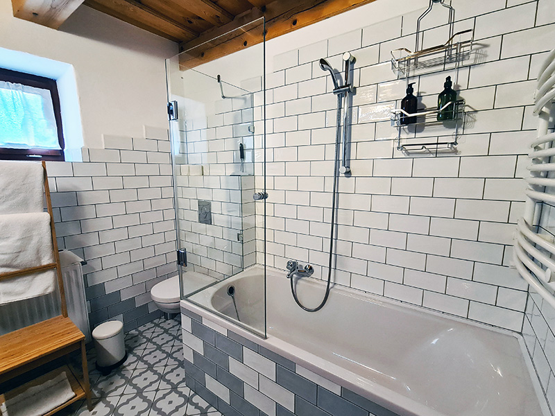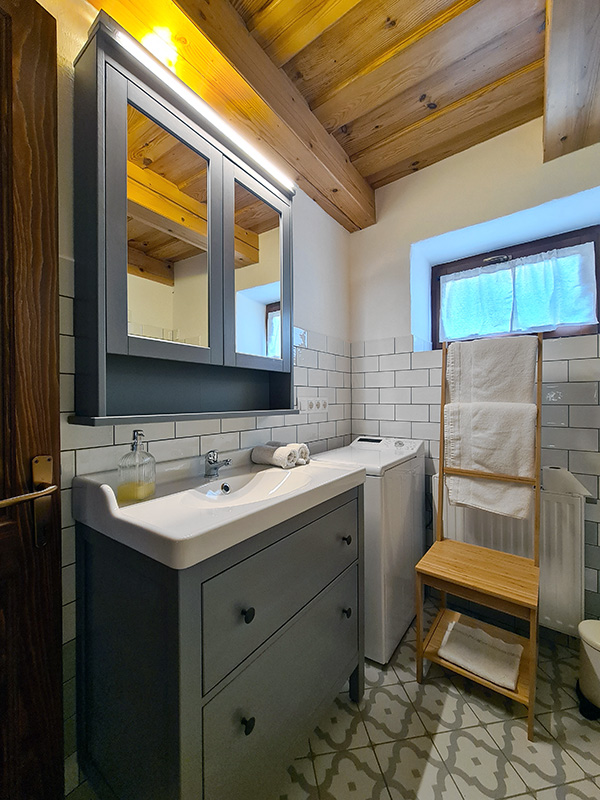 - Fürdőszoba és WC káddal, tárolós tükrös szekrénnyel, mosógéppel. További felszereltség: hajszárító, vasaló és vasalódeszka.