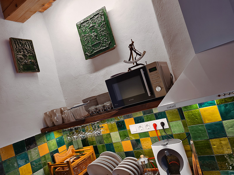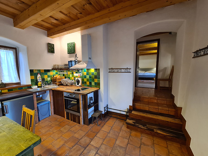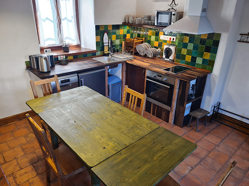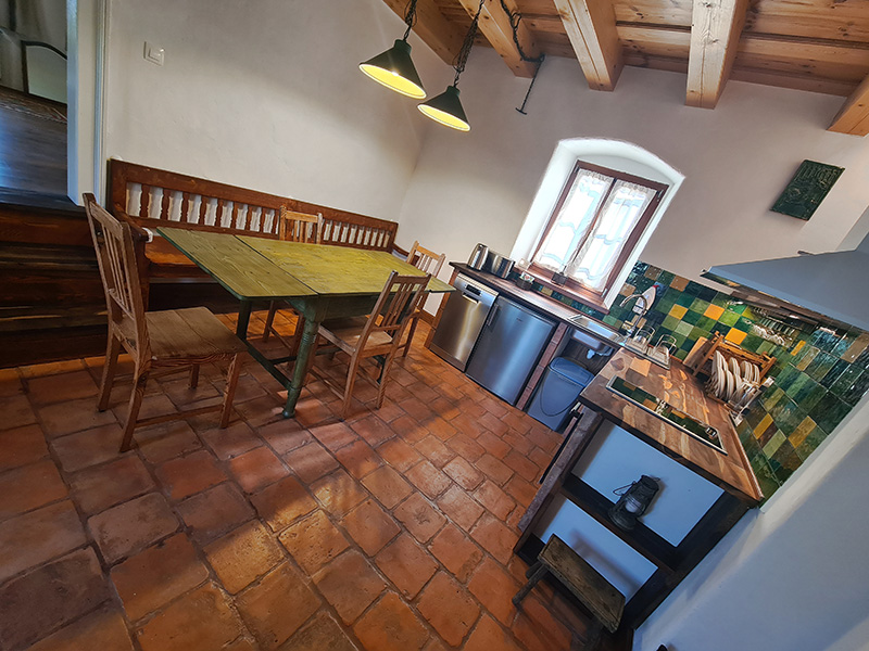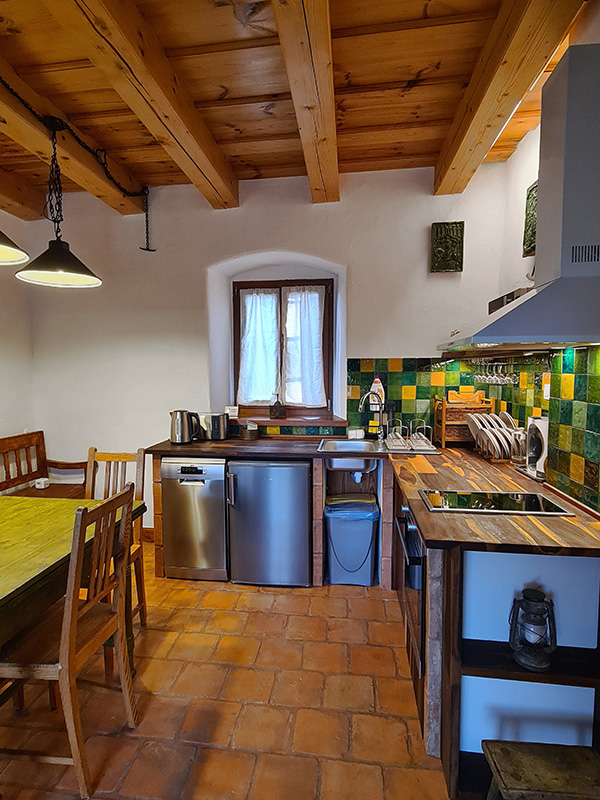 - Konyhában található az étkezőasztal (bővíthető méretű), egy hosszú lóca és székek, hűtőszekrény, mosogatógép, mosogató, kenyérpirító, vízforraló, elektromos sütő, mikrohullámsütő, kapszulás kávégép1, tároló (lábosok, serpenyő, szűrő, tölcsér és egyéb konyhai eszközök), 10db tányér szett (lapos, mély, tál), 10db evőeszköz szett (villa, kés, nagy – és kis kanál), 10db vizespohár, borospohár és csésze, dugóhúzó, sörnyitó, szeletelő kések, vágódeszka, olló, szemetes (vegyes és műanyag szelektív) stb.